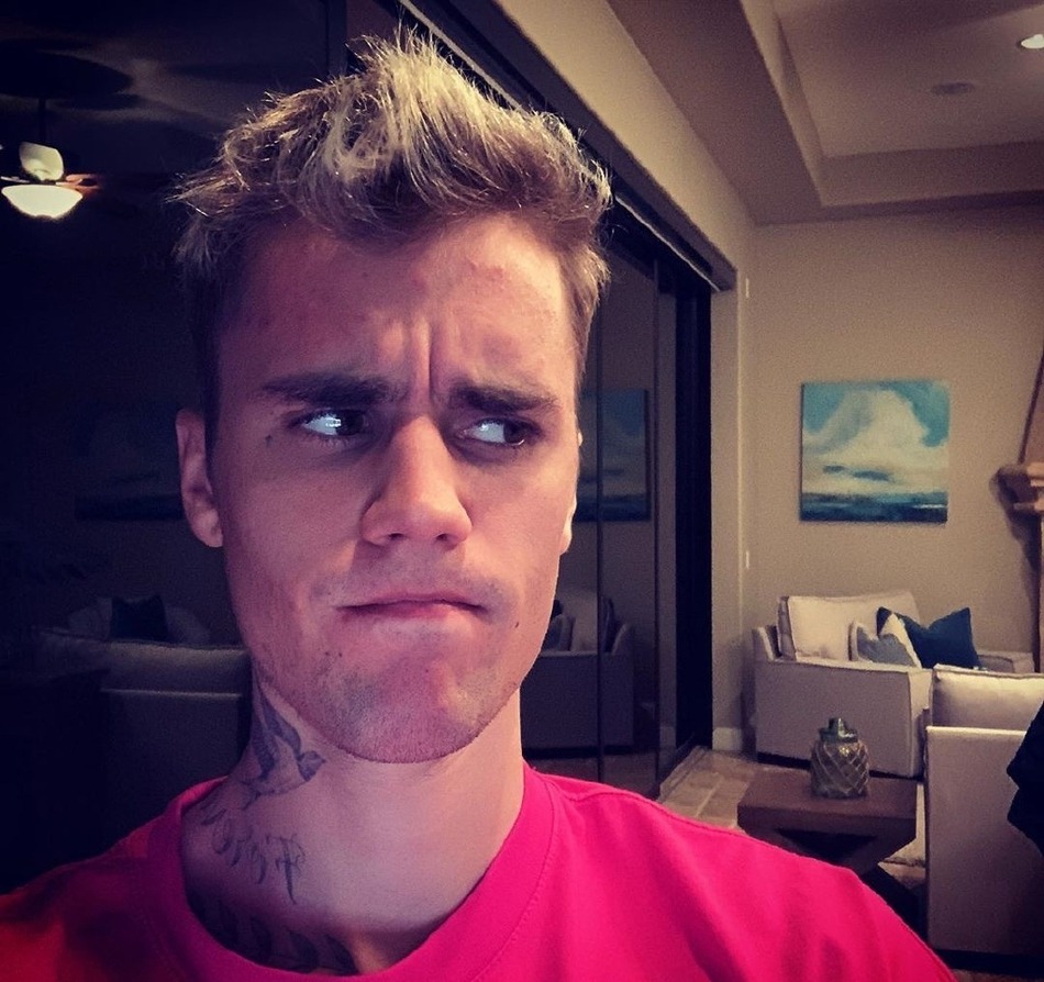 比伯瞪眼撇嘴自拍,可爱又逗趣。