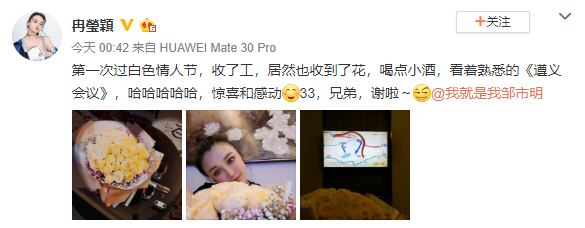 “第一次过白色情人节,收了工,居然也收到了花,喝点小酒,看着熟悉的《遵义会议》,哈哈哈哈哈,惊喜和感动。33,兄弟,谢啦~”,并@了老公邹市明。照片中,冉莹颖怀抱一束粉色的玫瑰,歪头自拍少女感十足。