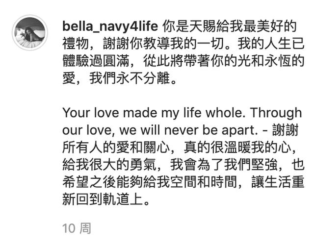 Bella曾讲,你是天赐给我最美好的礼物,谢谢你教导我一切。我的人生已经体验过圆满,从此将带着你的光和永恒的爱,我们永不分离。