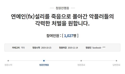 今天(10月15日)上午发起的这项请愿主题为“要求强力处罚害死雪莉的恶意攻击者”。请愿发起人表示如果不加强对网上恶意攻击者的处罚力度,这样的悲剧还是会继续上演,因此政府应修改法律来强化对恶意攻击者的处罚。