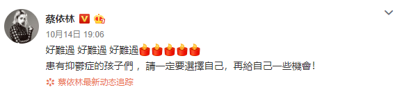 蔡依林悼念的同时并沉痛呼吁:“患有抑郁症的孩子们 ,请一定要选择自己,再给自己一些机会!”引来大批粉丝留言“活着就有希望”、“谢谢你挺过来了,谢谢你成为了更好的蔡依林 ”。