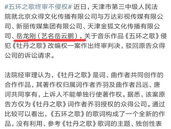 据媒体报道,由于岳云鹏演唱的歌曲《五环之歌》涉嫌侵犯《牡丹之歌》的改编权而被告上法庭,诉讼书中无意间曝光了他的本名,成为网友今日份快乐源泉,纷纷留言调侃他“你好岳龙刚,重新认识一下”“哥们,你和岳云鹏什么关系。”