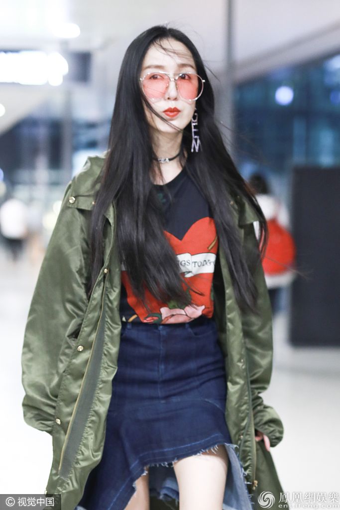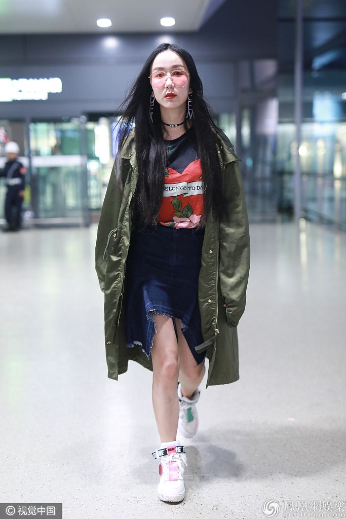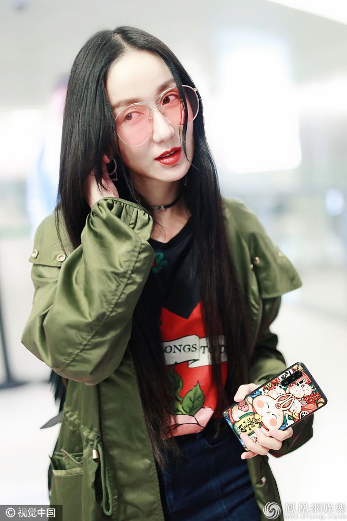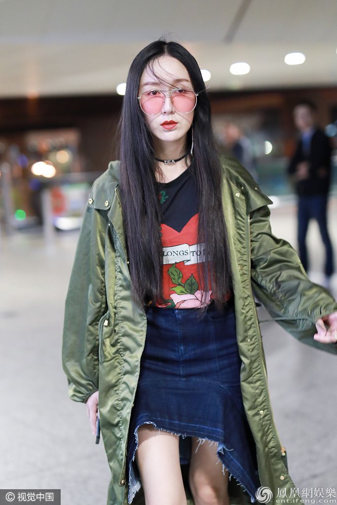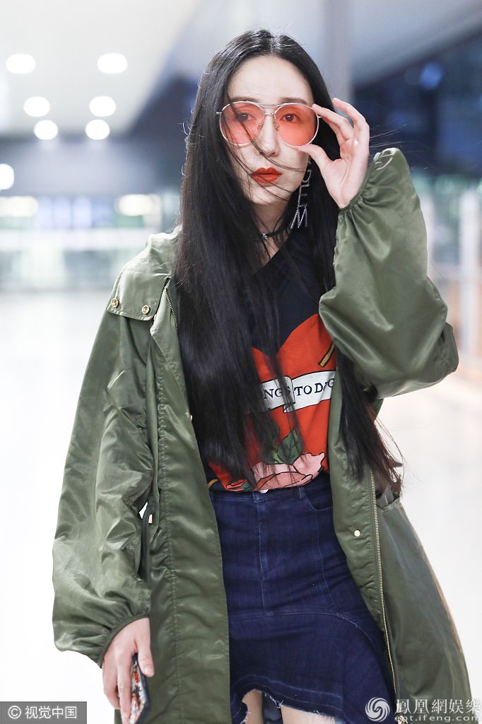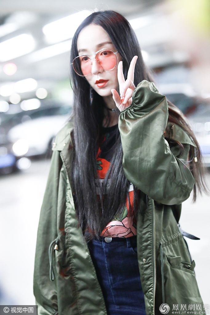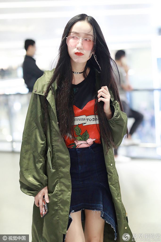 2019年10月14日,上海,娄艺潇现身机场。她留着一头黑色长发戴着红色墨镜,身穿军绿色外套和牛仔连衣裙,秀出白嫩美腿。娄艺潇对镜头比耶嘟嘴,表情丰富生动可爱。 图片来源:无敌Ccccc/视觉