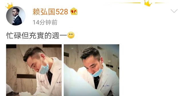 赖弘国最近更新动态相当频繁。照片中的他戴着黑色领带,穿着白大褂,戴着医用口罩,工作的模样看起来格外认真和专注,想必技术也非常精湛吧!