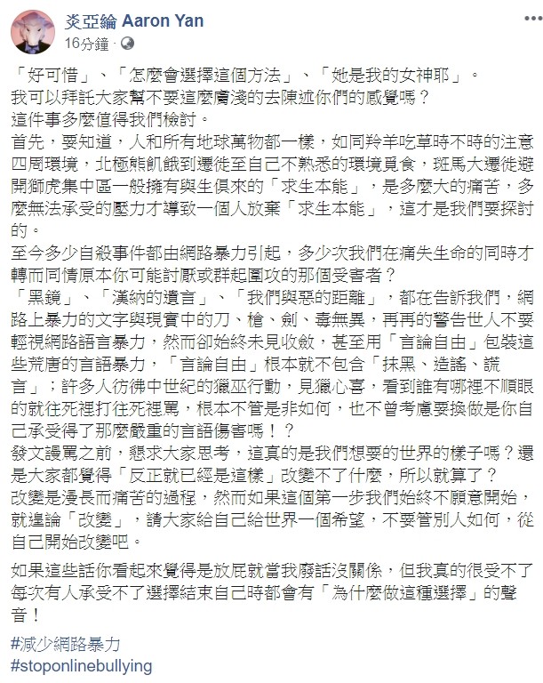 炎亚纶也感慨,许多人用“言论自由”来包装语言暴力,仿佛中世纪猎巫一般,见猎心喜,“看到谁有哪里不顺眼的就往死里打往死里骂,根本不管是非如何,也不曾考虑要换做是你自己,承受得了那么严重的言语伤害吗!?”他强调,言论自由不包括抹黑、造谣、谎言,请大家发文谩骂之前先思考,“这真的是我们想要的世界的样子吗?”