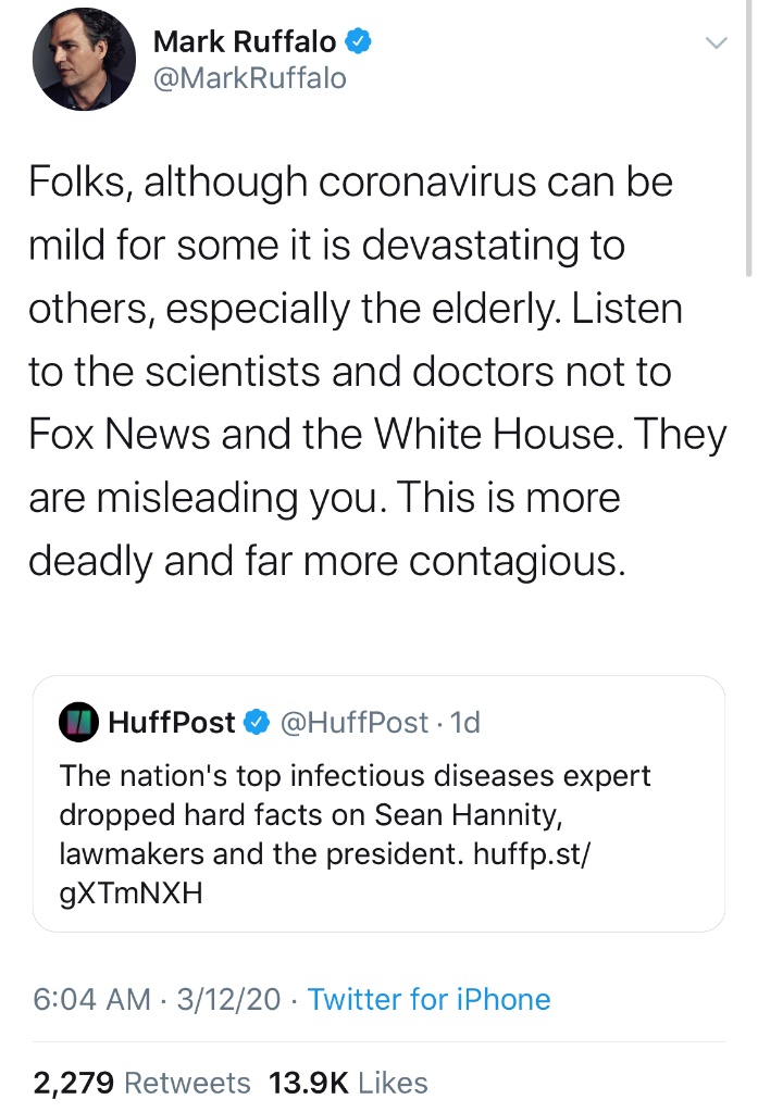 “绿巨人”演员马克·鲁弗洛(Mark Ruffalo)在推特上呼吁大家:“新冠病毒的传播力和致死率比一些人想象的要严重,特别是对老年人很危险,不要听白宫和福斯新闻,他们的消息有误导性,还是相信医疗工作者和科学家的。”