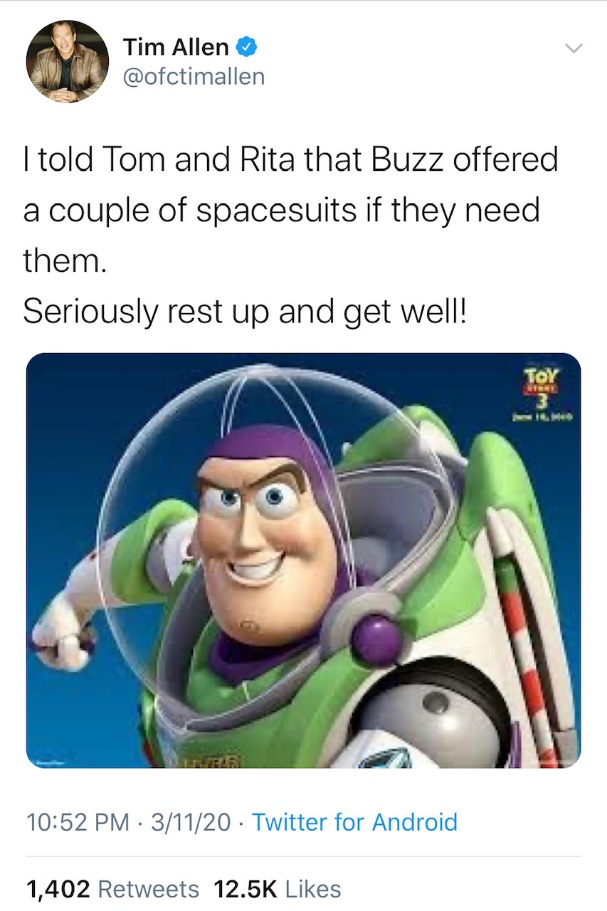 与汉克斯一起为《玩具总动员》系列配音的演员蒂姆·艾伦 (Tim Allen,为巴斯光年配音)在推特上表示:“我应该让你们夫妇穿上我巴斯光年的宇航服!希望你们赶快好起来啊!” 并配上了巴斯光年戴着头盔的图片。