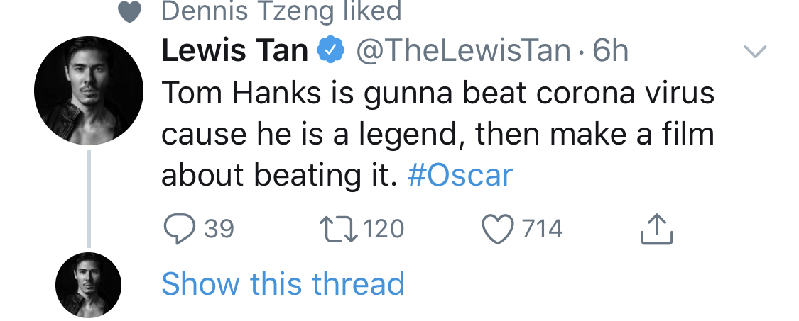华裔演员刘易斯·谭(Lewis Tan)则在推特上写道:“汤姆汉克斯不仅会战胜病毒,他还会把自己战胜毒的经历拍成电影!”