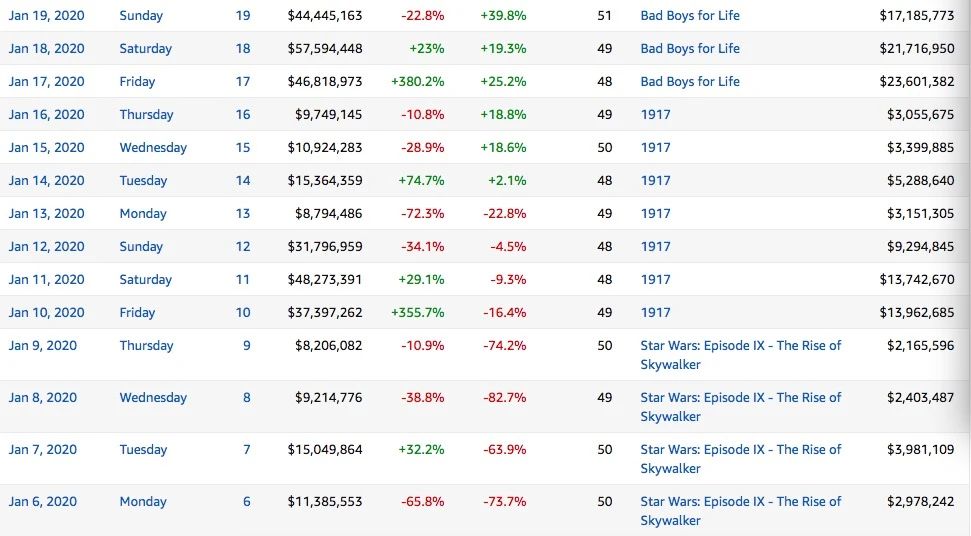 紧接着《星球大战》第二次点燃美国市场的电影是国内由中影发行、阿里影业联合出品的《1917》。影片在北美上映第一天就将当日总票房推高至3739万美元,较前一天环比上涨了355.7%。