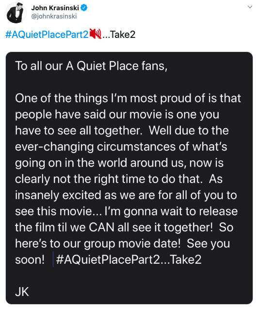 当地时间3月12日,受新冠肺炎疫情影响,热门惊悚片《寂静之地2》宣布全球撤档,新档期待定。导演约翰·卡拉辛斯基在社交媒体上发布了这一决定,表示“等我们可以一起去看这部电影时再上映”。