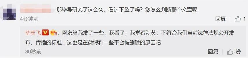 毕志飞也直接了当地回答了这个问题,坚定表示这篇文章涉黄,不符合目前法律法规中文学传播的标准,被删除也是有原因的。