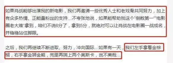 在被网友注意之后,毕志飞又一次发文谈及肖战,表示他要请肖战演他的新电影,让肖战和老戏骨合作,然后一战成名,左手金棕榈右手奥斯卡稳稳站进电影圈。当时,毕志飞这篇文章一发瞬间就顶上了热搜,之后更是成为了人尽皆知的段子一则。