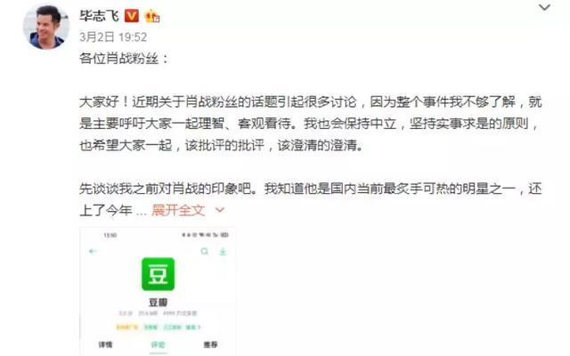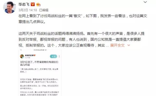 而在此之前,毕志飞也是全方面参与了这次事件。在肖战粉丝投诉事件刚刚开始,他就发长文质疑讨伐肖战粉丝的一篇“檄文”。表示人人都有举报权,肖战不应因此受到牵连。