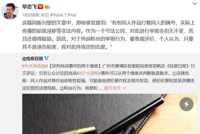 3月12日,导演毕志飞在看完检察日报的报道后发微博,并摘录了报道中另一方的观点:“郑检察官提到:‘有些同人作品打着同人的旗号,实际上传播的却是淫秽等非法内容。作为一个守法公民,对此进行举报非但无不妥,而且还值得鼓励。因此,对于肖战粉丝的举报行为,要客观评价,个人认为,只要其不是诬告陷害,应对此持肯定的态度。’”