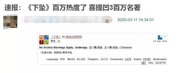 而《下坠》虽然是事件的导火索,让大家争执不断,但是实际上并没有受到影响,反而因为网上热度不断,直接成为了外网ao3唯一出圈中文作品,全站kudos排名第16位。