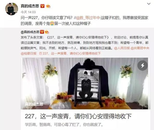 知名主持人成杰思也多次发文抵制227粉圈青年,并郑重言词表示自己维护的不是肖战,而是自己的三观。