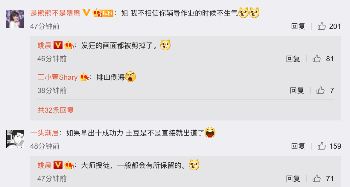 评论中,有网友留言,称“姐,我不相信你辅导作业的时候不生气”,姚晨则回答道,“发狂的画面都被剪掉了”。还有网友调侃,“如果拿出十成功力,土豆是不是直接就出道了”,姚晨也幽默回复,“大师授徒,一般都会有所保留的”。