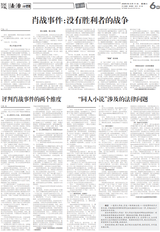 3月11日,《检察日报》在第五及第六版法治评论版,连续刊登了五篇评论文章。