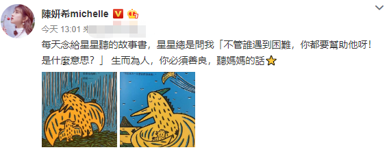 陈妍希在配文中称:“每天念给星星听的故事书,星星总是问我‘不管谁遇到困难,你都要帮助他呀!是什么意思?’ 生而为人,你必须善良,听妈妈的话”。