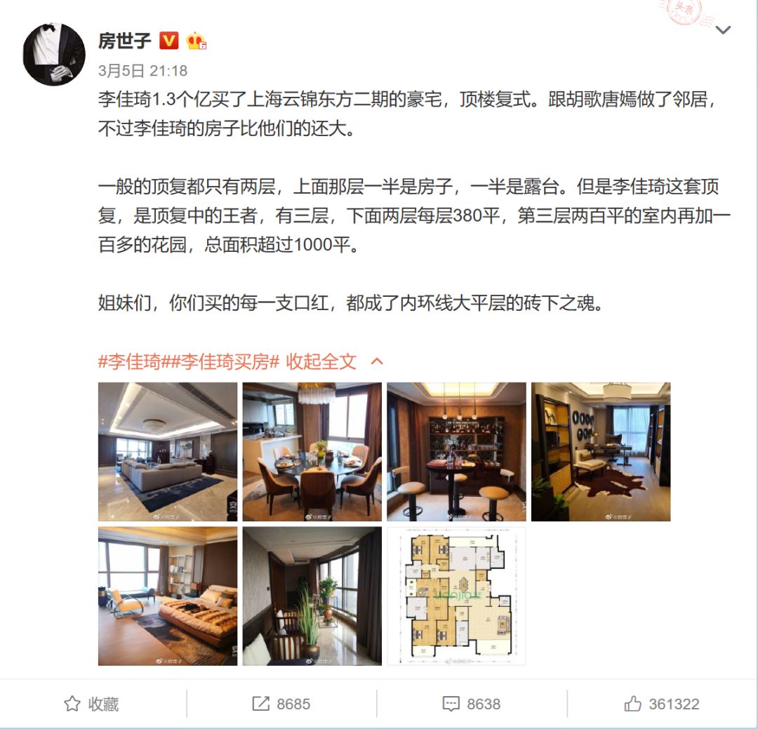 3月5日晚,微博上一个粉丝49万的房地产博主突然爆料称,李佳琦1.3个亿买了上海一处顶楼复式的豪宅,跟胡歌唐嫣做邻居。最后总结说“姐妹们,你们买的每一支口红,都成了内环线大平层的砖下之魂