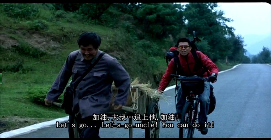 老赵有过可爱的一面,拉着装着工友的小推车却和一旁的牛车较劲。