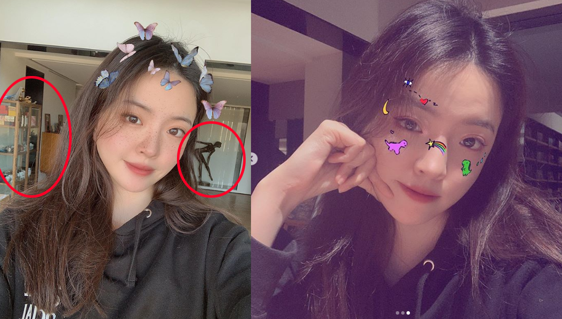 而且从晒出的照片背景看,身后有一个艺术气息十足的雕像橱窗,还有一个展示柜里摆满了各种收藏品,整体的装修则是以简约的风格为主。