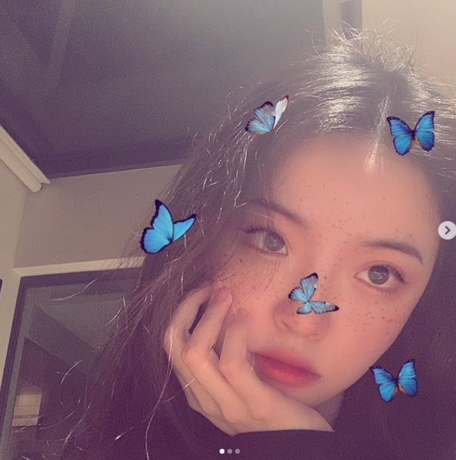 王文也穿着一身黑色的卫衣,披散着棕色头发,脸上的雀斑滤镜和花蝴蝶头饰,给原本漂亮的王文也增添了几分的纯真。