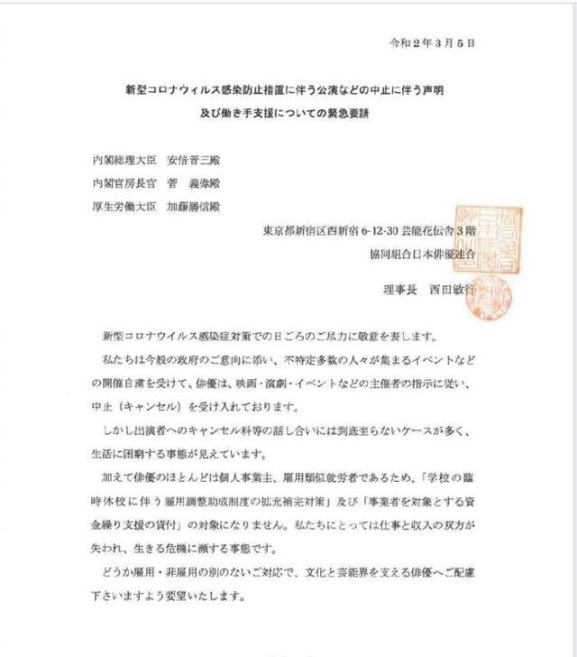 请愿书中表示,演员们几乎是自由职业,并不会像学校教师一样拿到政府的资助,而出于对公众安全的考虑,日本政府近日叫停了大部分文艺演出,致使很多演员都失去了工作和收入,面临着严重的生存危机,因此演员联合会发表声明希望可以得到政府的援助。