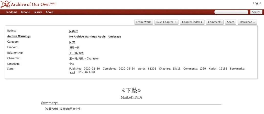 同人创作者当然清楚这是不适合拿到公众平台上分享的,所以他们会设置各种各样的障碍和门槛,比如发在一些小众网站上,而且这些网站要设计重重标签,使得圈外的人最大可能性地点不进来。AO3网站就是这样,你首先要在几百个标签里找到这篇文,然后这篇文上会注明预警,提示你文章会写到什么,你接受不了就离开。