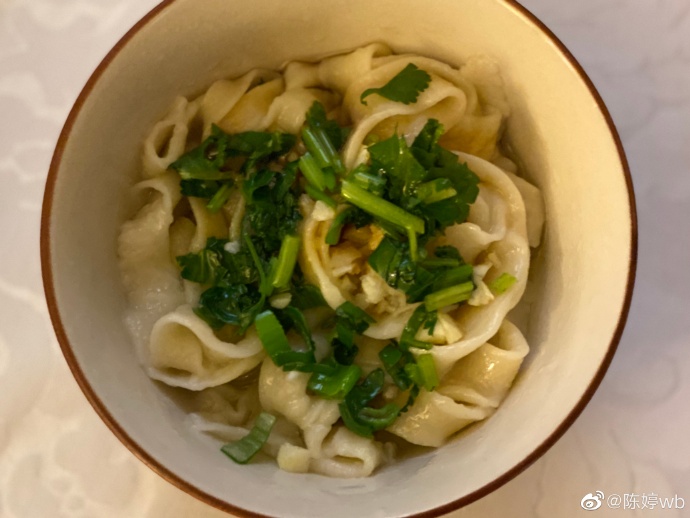 长寿面也是非常的简单,手擀面里面放点葱花和香菜,一碗简单的长寿面出炉。