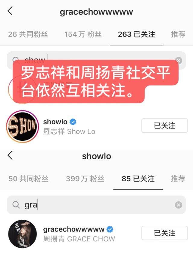 目前,罗志祥与周扬青的所有社交平台仍然是互相关注的状态,并且周扬青还是罗志祥某短视频平台的唯一关注,所以大部分网友还是倾向于二人只是冷战,并未分手。