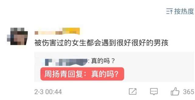 除此之外,周扬青还突然伤感起来,在朋友的评论区留言:“当他有勇气把他的不快乐都打开的那一天,他就会开始接受新的快乐”,以及粉丝给她留言:“被伤害过的女生都会遇到很好很好的男孩”,周扬青反问:“真的吗?”