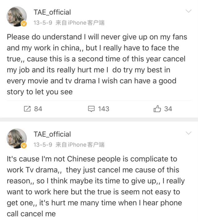 早年tae微博自曝是拍戏因国籍原因被拒。