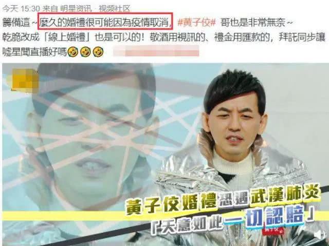 根据相关媒体报道,黄子佼和孟耿如预计在4月19日举行婚宴,但由于受到了疫情的影响,不得不推迟或取消。