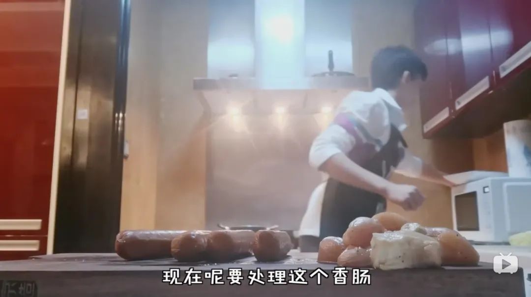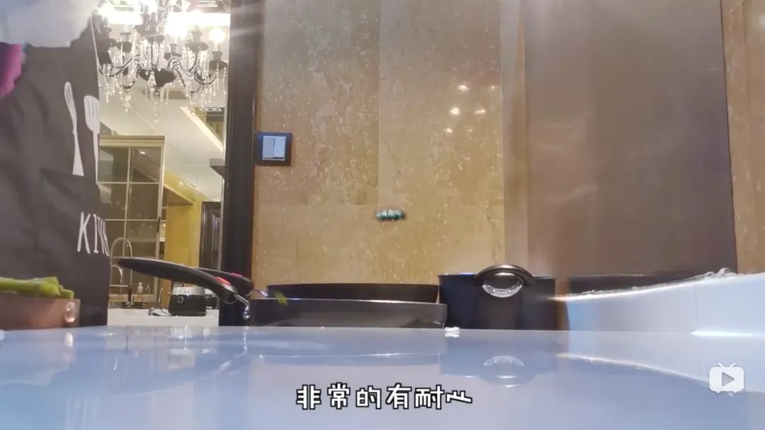 厨房看起来有两间,他在这边做饭,背后的玻璃门里,还有一个设施更齐全的厨房。