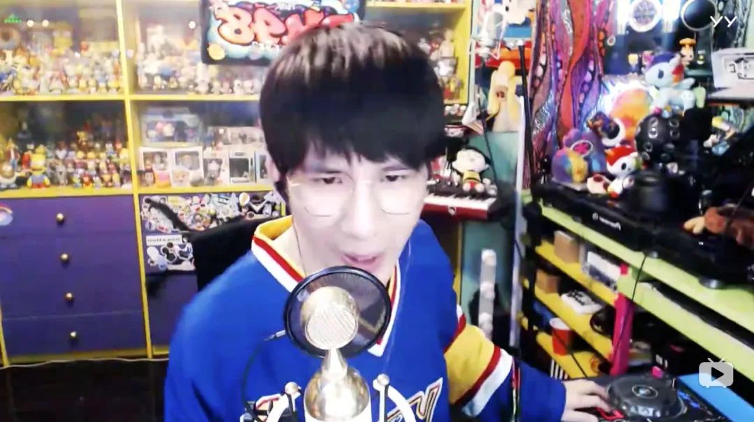 这段时间他在家里开直播,背景是个固定的专属的直播室,紫黄撞色的柜子上堆满密密麻麻的手办,还有各种浮夸图案的布艺装饰,所有颜色丰富造型各异的东西凑在一起,简直看得人眼花缭乱。