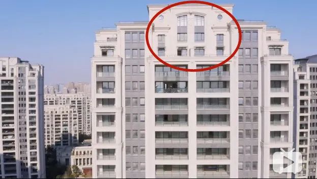 楼层外观长这样。红圈区域应该就是李佳琦买下的高级三层顶复了。听说胡歌唐嫣也住在这儿,面积没有李佳琦的大,说不定他们还就是上下层的邻居呢!
