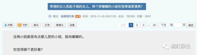 2013年有个网帖《李湘女儿与赵子琪女儿谁美》,拿俩孩子比美,有网友质疑:楼主玻璃心的语气像赵子琪本人,且发的照片网上找不到,也没带水印。