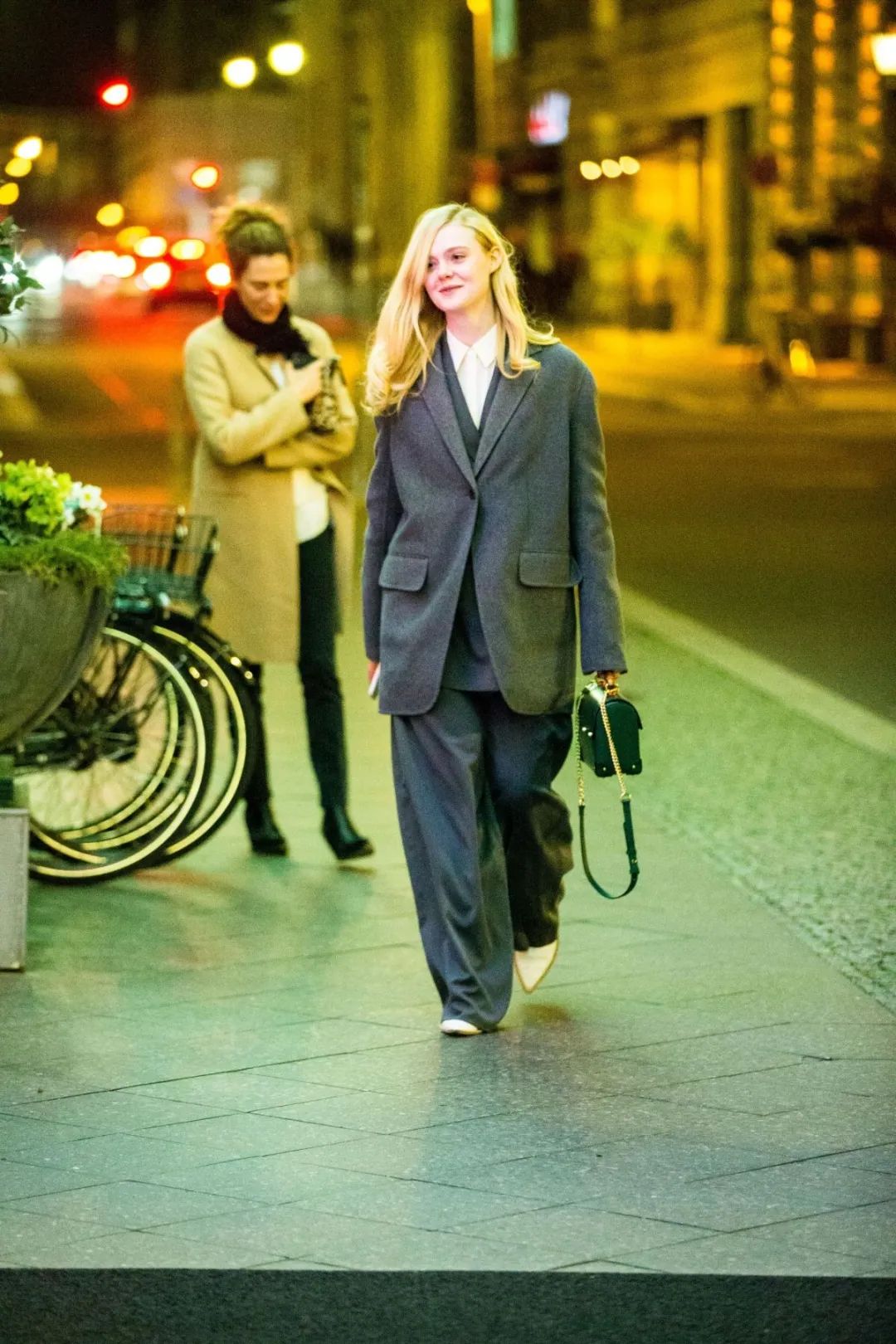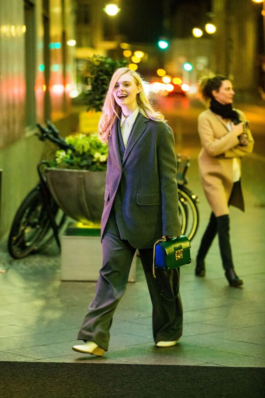 这组街拍照里的艾丽·范宁显然没有在乎打扮够不够时尚之类的。与此同时,你也依然能够感受到她的快乐与惬意。
