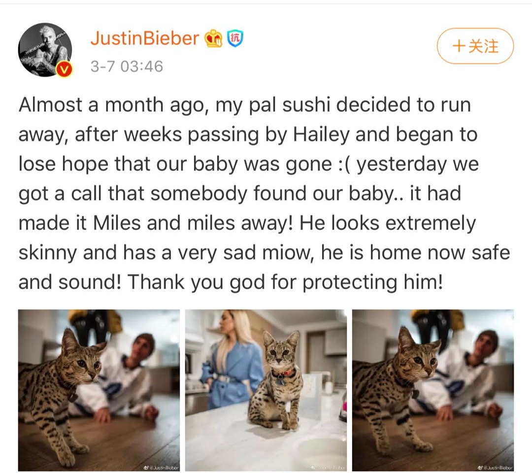 3月7日凌晨,比伯发文表示自己找到了失散已久的猫咪,言语中透露出欣喜和激动,也表示在看到猫瘦了以后的痛