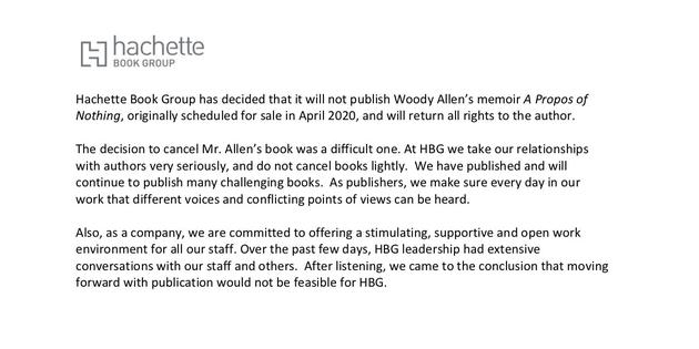 3月初,HBG下属大中央出版公司宣布:艾伦所著的自传传记书名为《凭空而来》(Apropos of Nothing),将于4月7日推出。据称,该书是84岁的他对自己人生的详尽记录,有私人生活,也有事业方面:电影、戏剧、电视、夜总会、出版……艾伦也写到了他与家人、朋友和一生所爱们的关系。大中央在一年前拿下了该书版权,其发言人拒绝进一布透露书中内容。而早前也传出有该出版社员工对出版该书表示抗议。