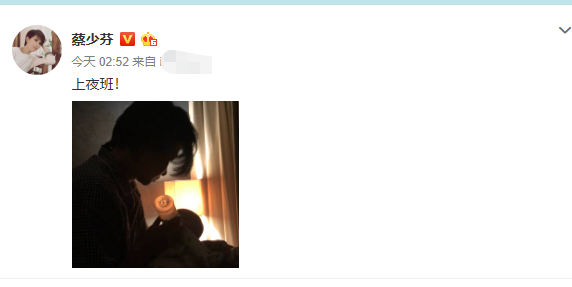 3月6日凌晨三点左右,蔡少芬在个人社交平台上分享老公张晋夜起喂孩子的照片,还调皮配文“上夜班!”