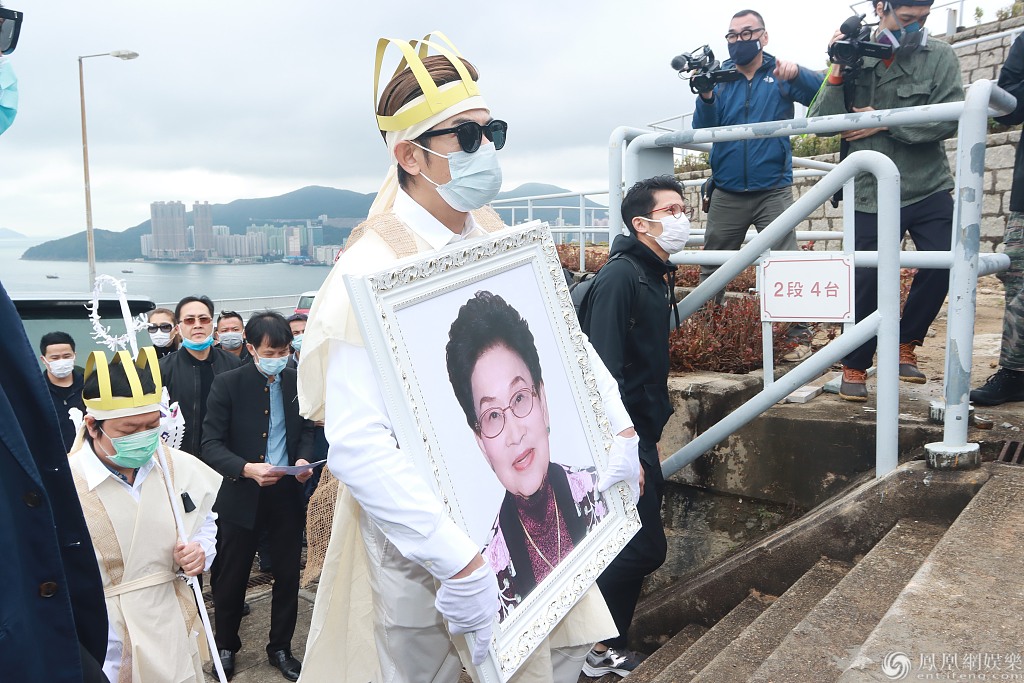 郭富城身穿孝服手捧母亲遗照,紧随棺木走上山。
