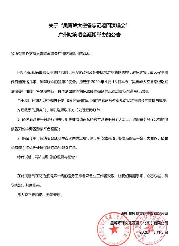 3月5日,吴青峰太空备忘记巡回演唱会的广州站主办方发布延期公告。据悉,吴青峰太空备忘记巡回演唱会广州站原定于4月18日举办,受疫情影响演唱会将延期举行,具体演出时间待定,将依据疫情控制情况通过官方渠道另行通知。
