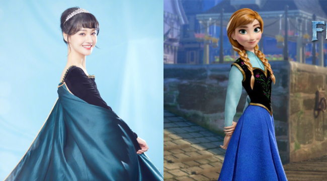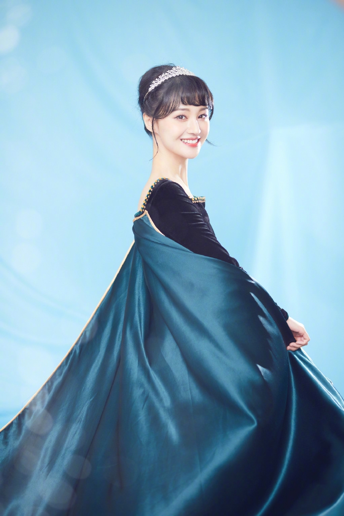 照片中的郑爽身穿黑色与深绿色相间的丝绒公主裙,十分优雅高贵。