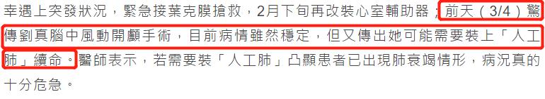 3月5日,台媒报道出刘真的最新消息,在接受了长达一个月的持续抢救之后,她的情况依旧不容乐观,还可能需要装上人工肺续命,据某医师透露,刘真恐怕出现了肺部衰竭的情况,运气真的不大好