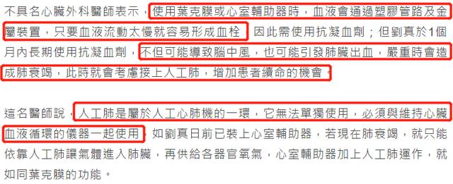 据医生表示,刘真因为装上心室辅助器,使血液流动太慢就容易形成血栓,所以需使用抗凝血剂,不过她1个月内长期使用,不但导致了脑中风,也可能引发肺部出血,严重时造成肺衰竭,此事就会考虑接上人工肺,增加患者续命的机会。