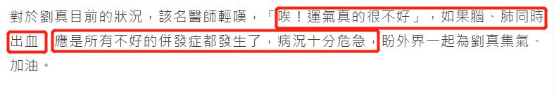 对于刘真目前的状况,该名医生轻叹:“唉!运气真的很不好,如果脑、肺同时出血,应是所有不好的并发症都发生了,情况十分危急。”