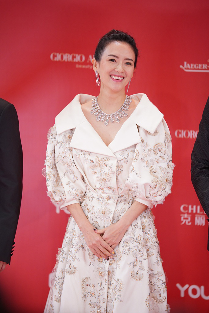 章子怡一身刺绣白色长裙,气场全开,对着镜头浅笑嫣然。