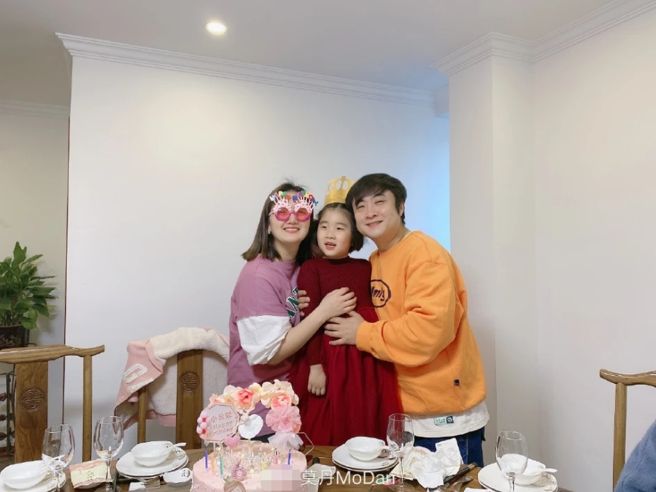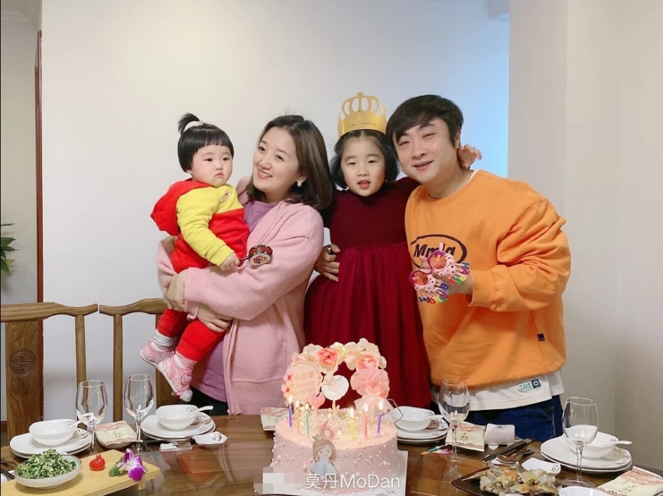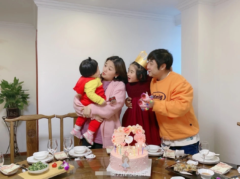 3月28日,乔杉老婆莫丹晒出一家四口的全家福,为大女儿垛姐庆祝6岁生